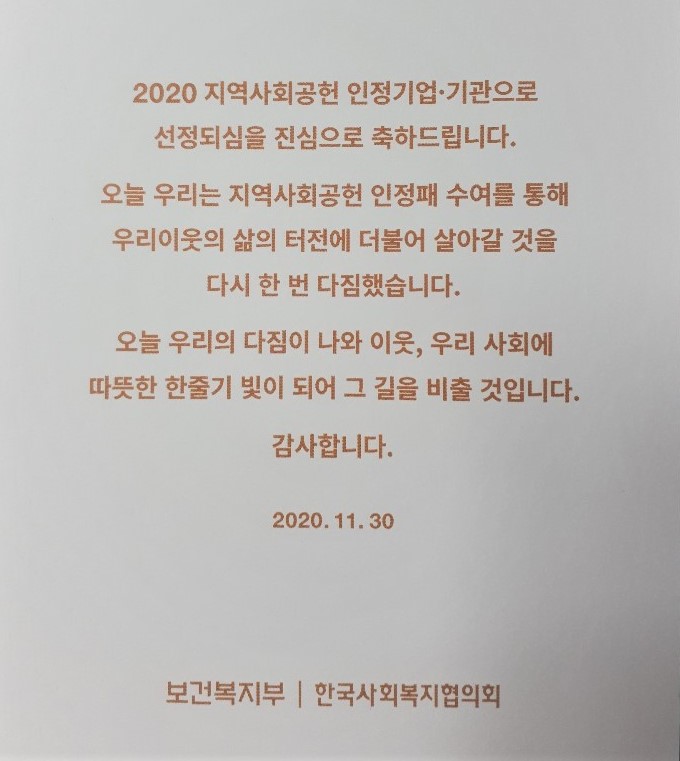 민들레의료사협, 2020 지역사회공헌 인정패 수여 상세내용