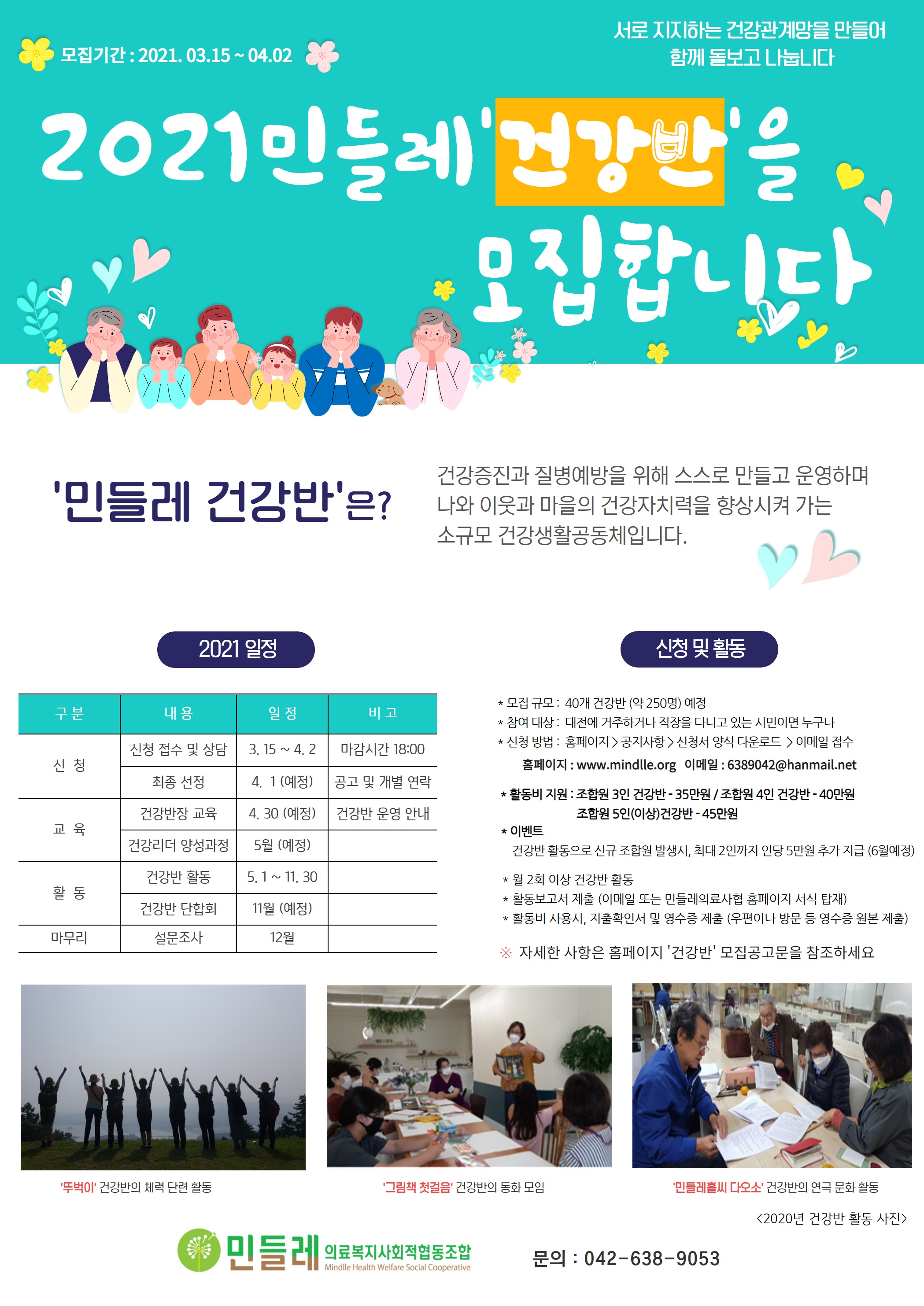 2021년 3월 15일 민들레의료복지사회적협동조합이사장 [모집 개요] ❍ 모집기간 : 2021. 3. 15. ~ 4. 2. ❍ (활동기간) 2021. 5. 1 ~ 2021. 11. 30 ❍ (활동지역) 내가 살고 생활하는 삶터, 배움터, 일터 등 나의 생활공간 어디서나 가능 ❍ (참여대상) -건강을 협동으로 만들어 가고자 하는 민들레의료복지사회적협동조합 조합원 -대전시민(개인 사업장이나 직장이 대전 내 가능) ❍ (필수조건) - 건강반 최소 구성 5인 이상 / 민들레의료사협 조합원 참여 비율 50% 이상 - 최소 구성 5인은 건강반 중복 참여 불가 ❍ (모집규모) 건강반 40개(250명) 예정 ❍ (활동비 지원) - 조합원 3인 건강반 : 35만원 - 조합원 4인 건강반 : 40만원 - 조합원 5인이상 건강반 : 45만원 ❍ (신청기간) 2021. 3. 15.(월) ~ 2021. 4. 2(금) 18:00 ❍ (신청방법) - 신청 서류를 첨부하여 E-Mail 6389042@hanmail.net 제출 - 방문 또는 우편 접수(대전광역시 대덕구 계족로 663번길 26, 민들레의원 4층) 18:00까지 ❍ (신청서류) ① 신청서 ② 운영계획서 ③ 승인 후 제출 : 개인정보제공동의서 ❍ (양식) 민들레의료복지사회적협동조합 홈페이지 서식 다운로드 http://www.mindlle.org/ ❍문의/ 조직협력국 638-9053