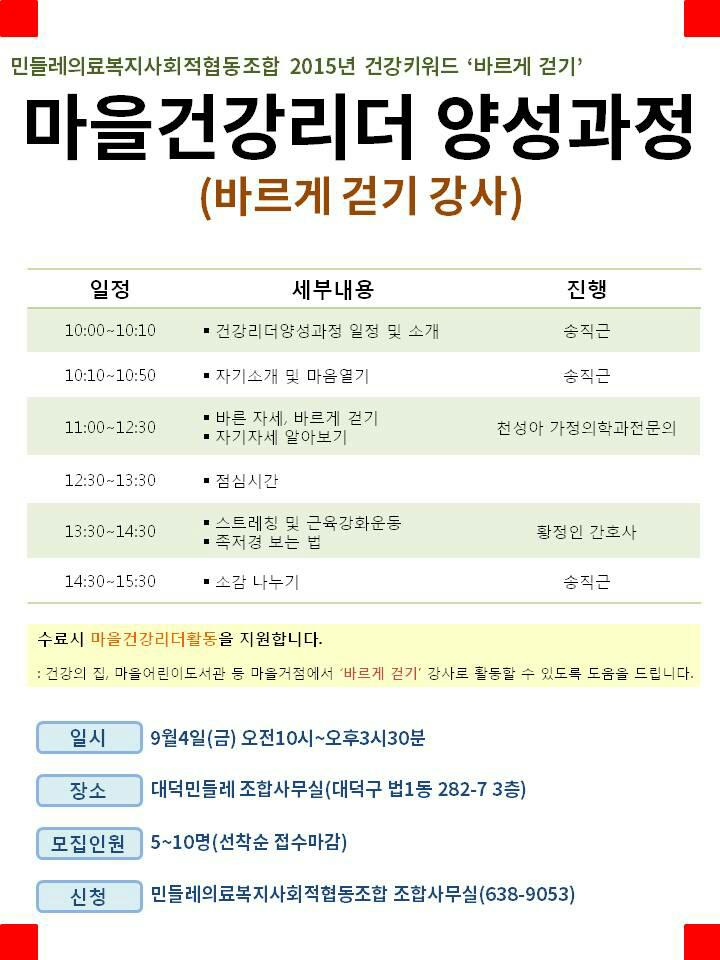 마을건강리더 양성과정 1탄 "바르게 걷기 강사 양성 과정" 이 이번주 금요일 9월 4일 하루 일정으로 진행됩니다. 양한방 원장, 간호사, 활동가들이 오랫동안 연구하여 만든 과정입니다. 민들레는 조합원 한 분 한 분의 건강한 몸과 마음, 지역사회를 위해 나부터의 생활실천에 앞장서서 이웃에 전파하시는 분들을 건강리더라고 부릅니다. 민들레의료복지사회적협동조합 조합원여러분의 많은 관심과 참여를 바랍니다.