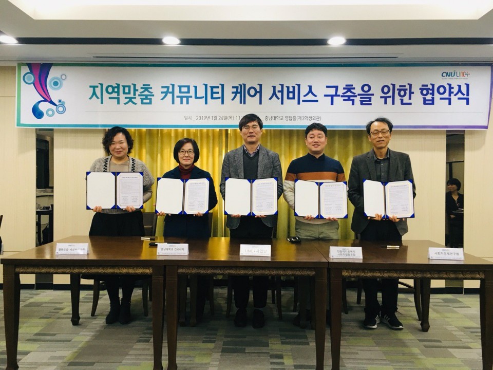 지역맞춤 커뮤니티케어 서비스 구축을 위한 협약식을 충남대학교 LINK+사업단, 협동조합세상속의과학, 충남대학교 간호대학, 사회적경제연구원과 진행했습니다.