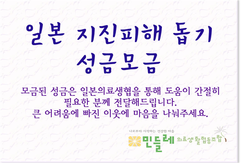 민들레의료생협에서도 큰 어려움에 빠진 일본을 돕기위한 모금을 합니다.